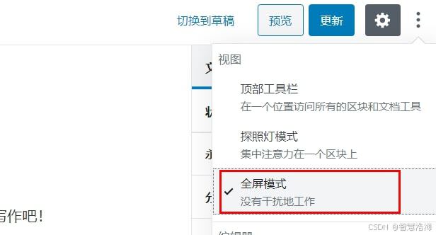 在WordPress 5.4版本更新后,为古腾堡编辑器默认采用了全屏的编辑模式,很多朋友可能并不习惯使用全屏模式来写作,那么如何关闭全屏模式呢?