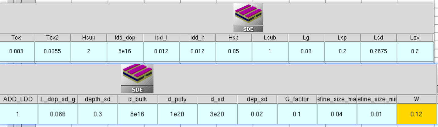 bulk的掺杂@d_bulk@ S/D的掺杂@d_sd@ LDD的掺杂@d_ldd@ 【有时候会遇到Ioff降不下去的情况,这个时候可以考虑加一个轻掺杂LDD】