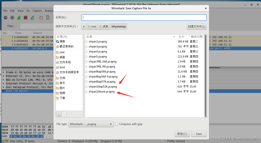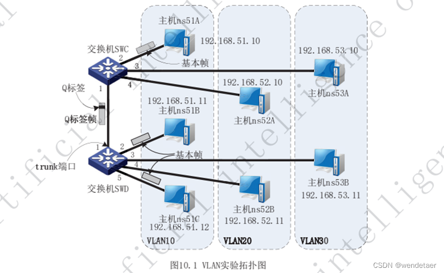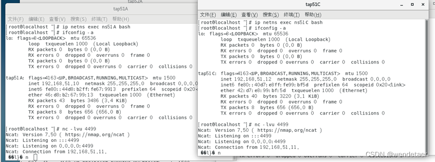 步骤3:在交换机SWC上启动Wireshark,在接口trunk上启动抓包。在主机ns51A上启动Wireshark,在接口tap51A上启动抓包。