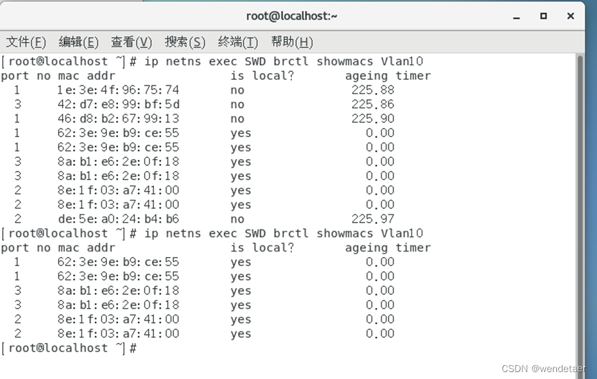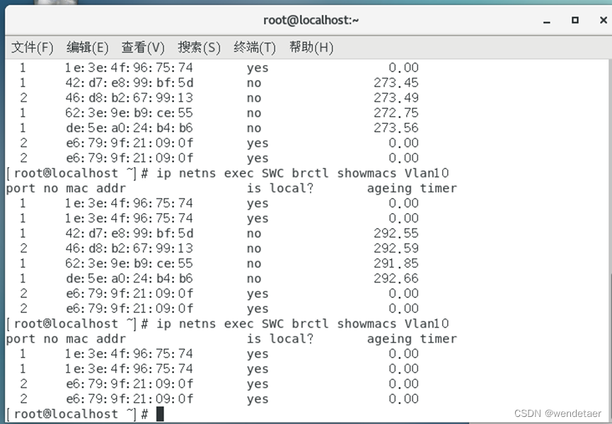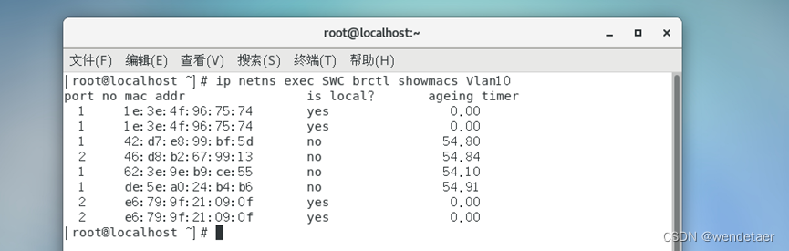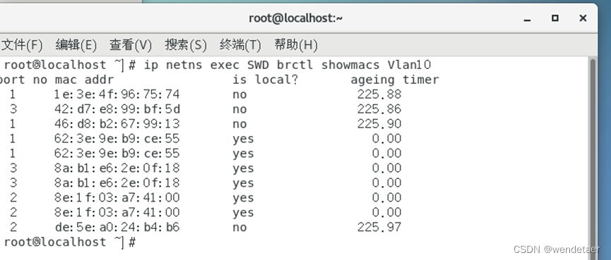 步骤6:在交换机SWC和SWD中,再次查看bridge设备Vlan10的交换表,分析交换表中的项目,理解交换机的逆向学习法。