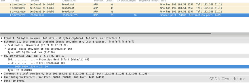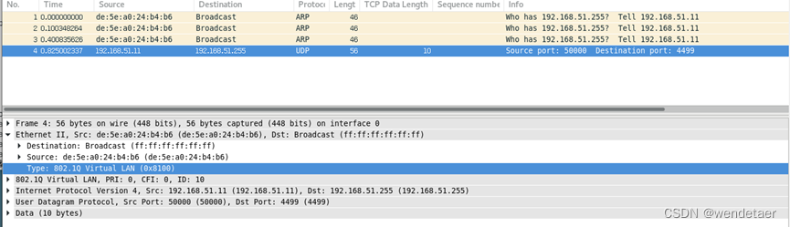 3.从Wireshark在trunk接口截获的数据帧中找出ns51B发送的广播报文,分析其帧结构,截图并填写表10.2。该帧的帧长是多少字节?如果有填充字段,填充了多少字节?截图说明你的分析过程。
