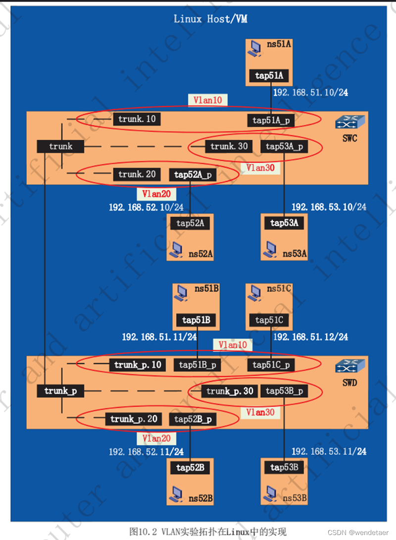 在Linux中,Vlan实验网络拓扑的实现如下图所示。