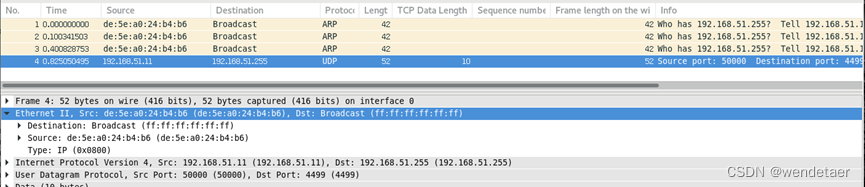 4.新打开一个终端窗口,执行如下Linux命令,指明目的MAC地址为全1的广播地址,构造包含10字节数据的UDP用户数据报,从主机ns51B上发送以太网广播。