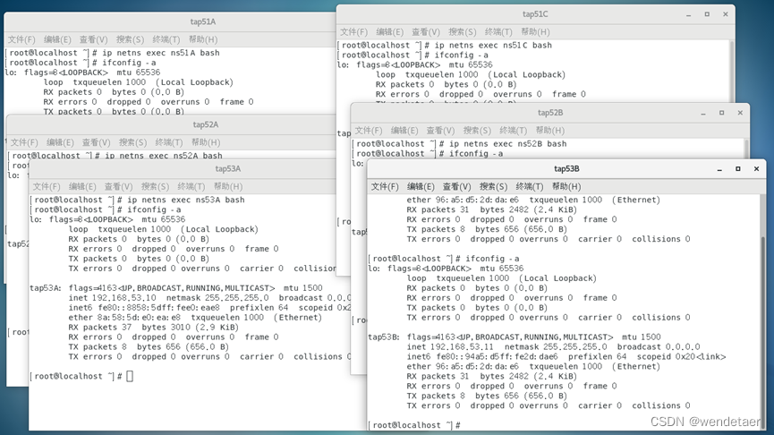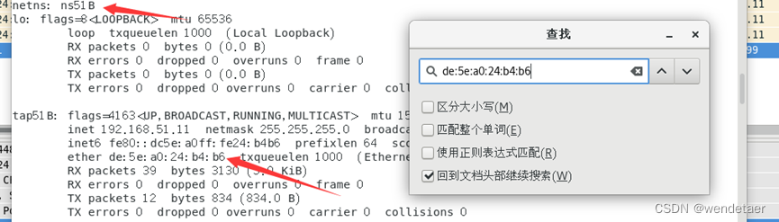 3.执行如下命令,查看所有命名空间中的网络接口,查找6-(1)和6-(2)中学习到的是哪个接口的MAC地址。根据课堂知识,理解交换机的逆向学习法。