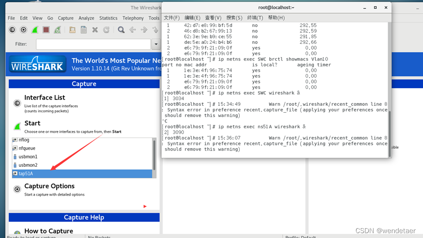 4.在Wireshark窗口中选择接口tap51A,启动抓包。