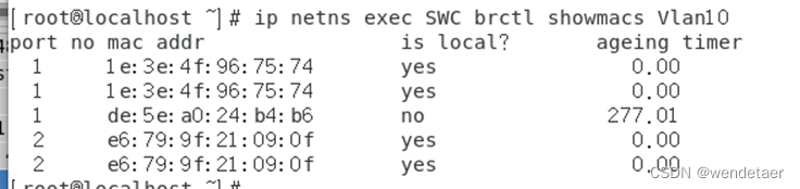 步骤2.:在交换机SWC和SWD中,查看bridge设备Vlan10的交换表