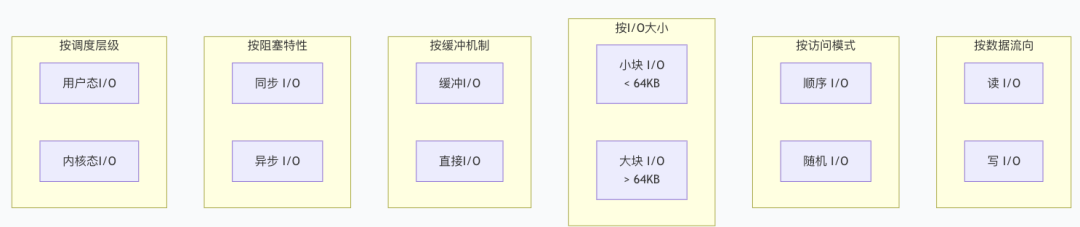 无论上层系统如何设计,业务数据最后都要存放到磁盘上做持久化。数据读写到磁盘的过程,必然牵扯到磁盘的I/O,以什么样的I/O方式存取数据,又决定了系统性能的差异。下面我列了一下按照不同的类型划分的I/O模式,我们重点说其中几个。