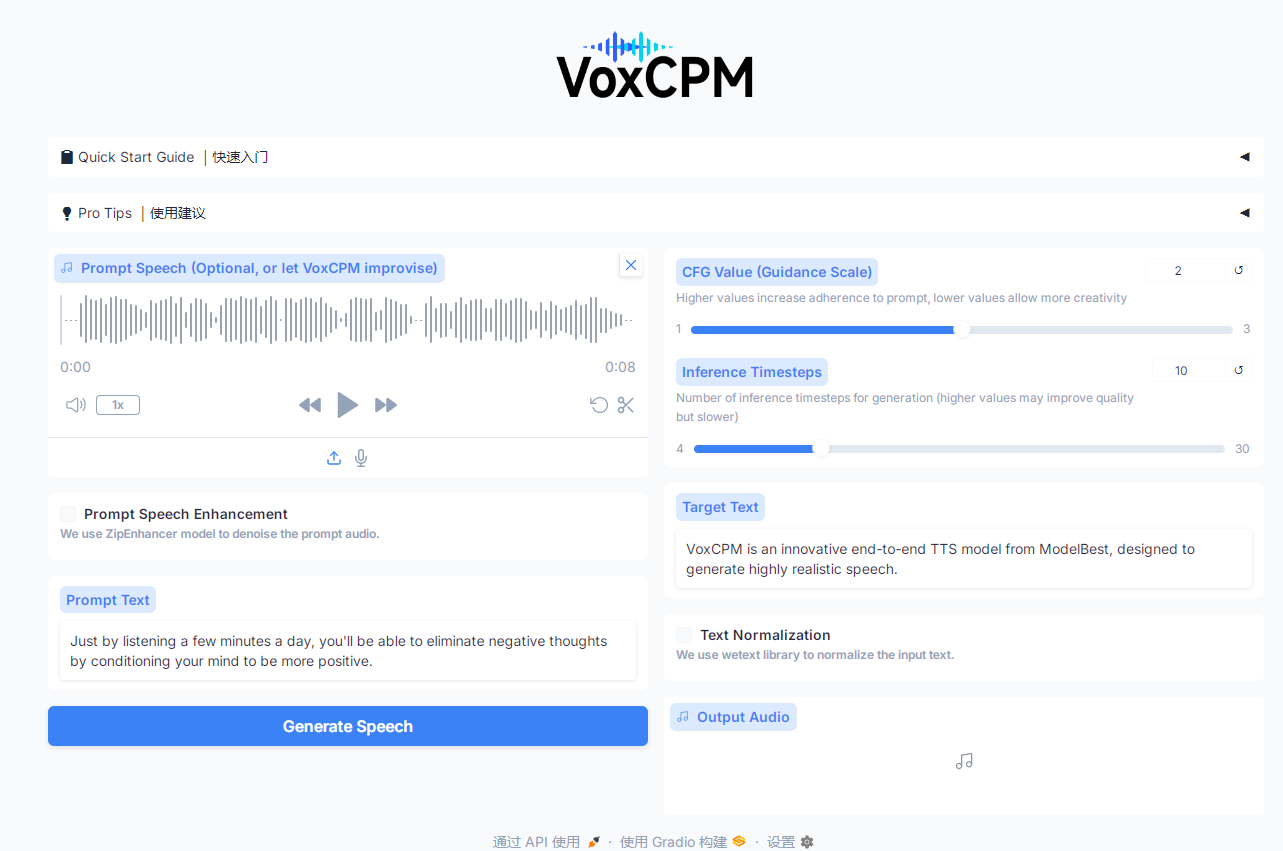 text="VoxCPM is an innovative end-to-end TTS model from ModelBest, designed to generate highly expressive speech.",