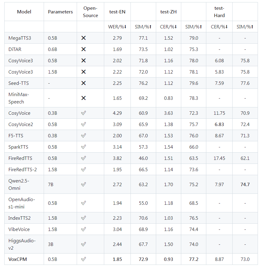 VoxCPM-0.5B 以轻量参数(仅 0.5B)实现了开源 TTS 的性能突破,在 Seed-TTS-eval 权威基准测试中,各项指标领先同类模型: