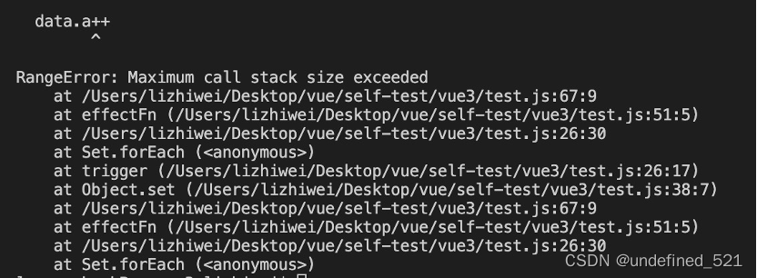 会产生这个问题,原因是fn中访问了data.a触发了get方法,把fn包了一层作为一个依赖收集到到了data.a对应的bucket中,然后又触发了data.a的set方法,于是又把bucket中的依赖拉出来执行,依赖执行的过程中又重复了以上的过程,最终导致栈溢出。其实这个问题的解决思路也不难想到,只需要在tigger方法遍历deps的时候加个activeFuction判断就可以了。