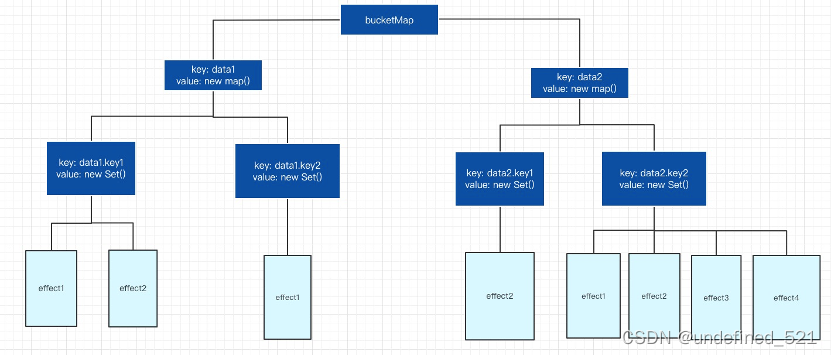如果bucket只是一个简单的Set结构,那么所有数据的依赖都会被收集到这个bucket中,当其中一个数据发生了改变就需要把bucket中收集的所有函数全部都执行一遍,这显然是不合理的。那么应该怎么做呢?首先需要一个合理的数据结构来存储这些函数,data、effect和bucketMap对应关系示例如下: