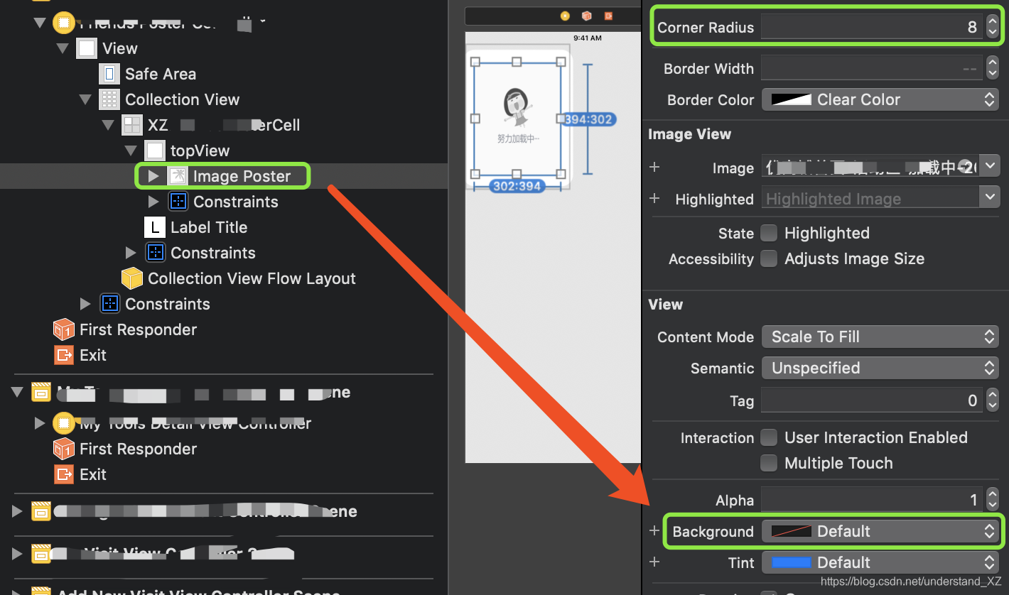 如下图,我们需要设置阴影加圆角的是图片ImageView,首先我们给图片欠套一个UIView(topView),欠套方法如下: