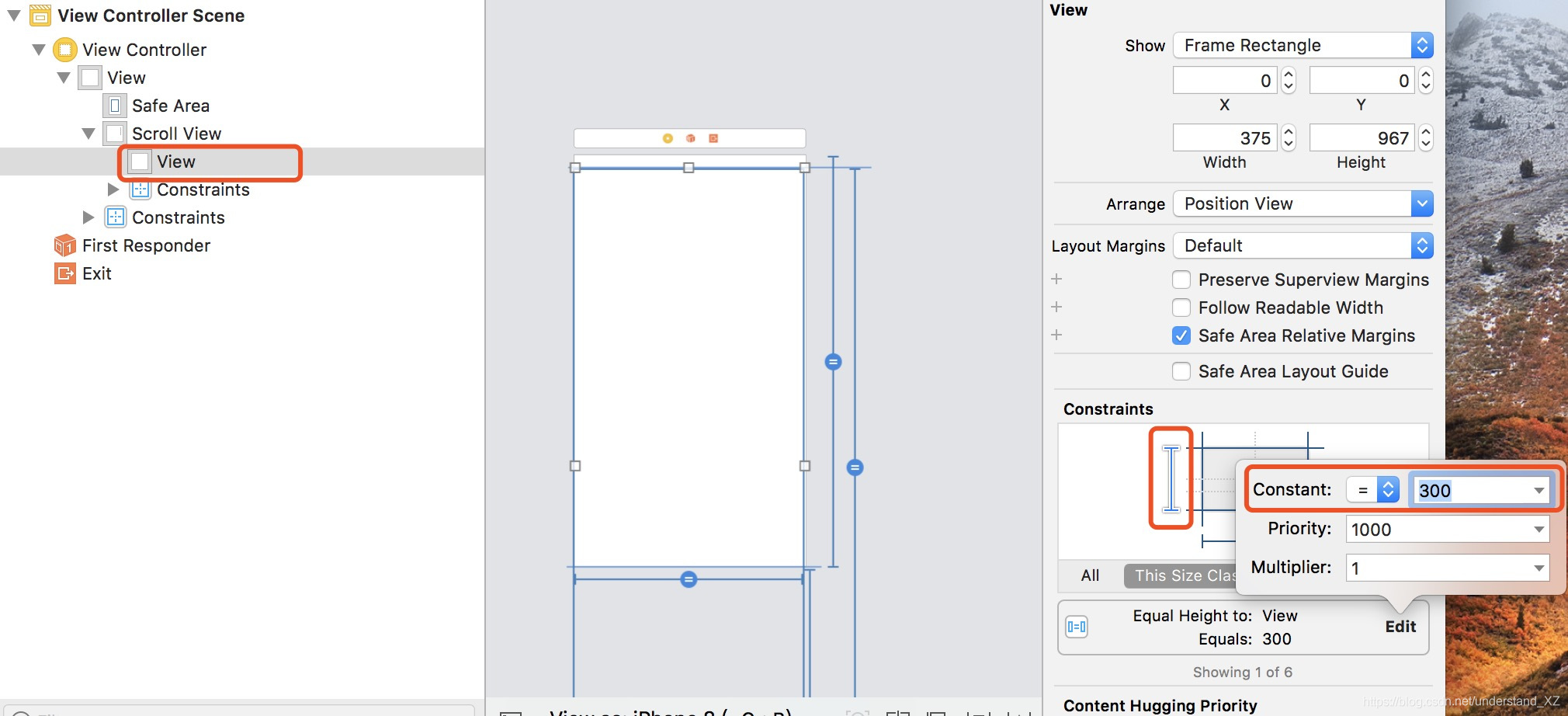 如果需要垂直滚动,则设置这个contentView的高度为需要的高度,如果需要水平滚动,则设置这个contentView的宽度为需要的宽度,既相当于设置scrollView的contentSize。例如需要设置垂直滚动,contentSize的高度为 屏幕高度+300,则在storyBoard中布局如下: