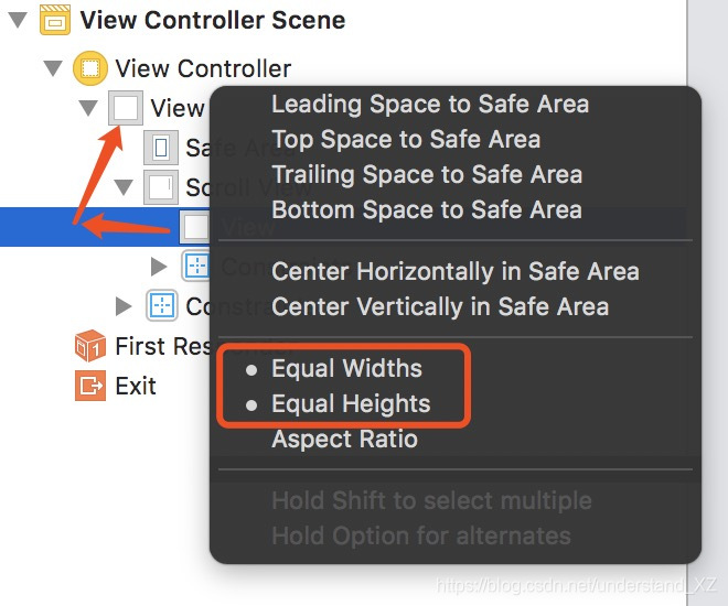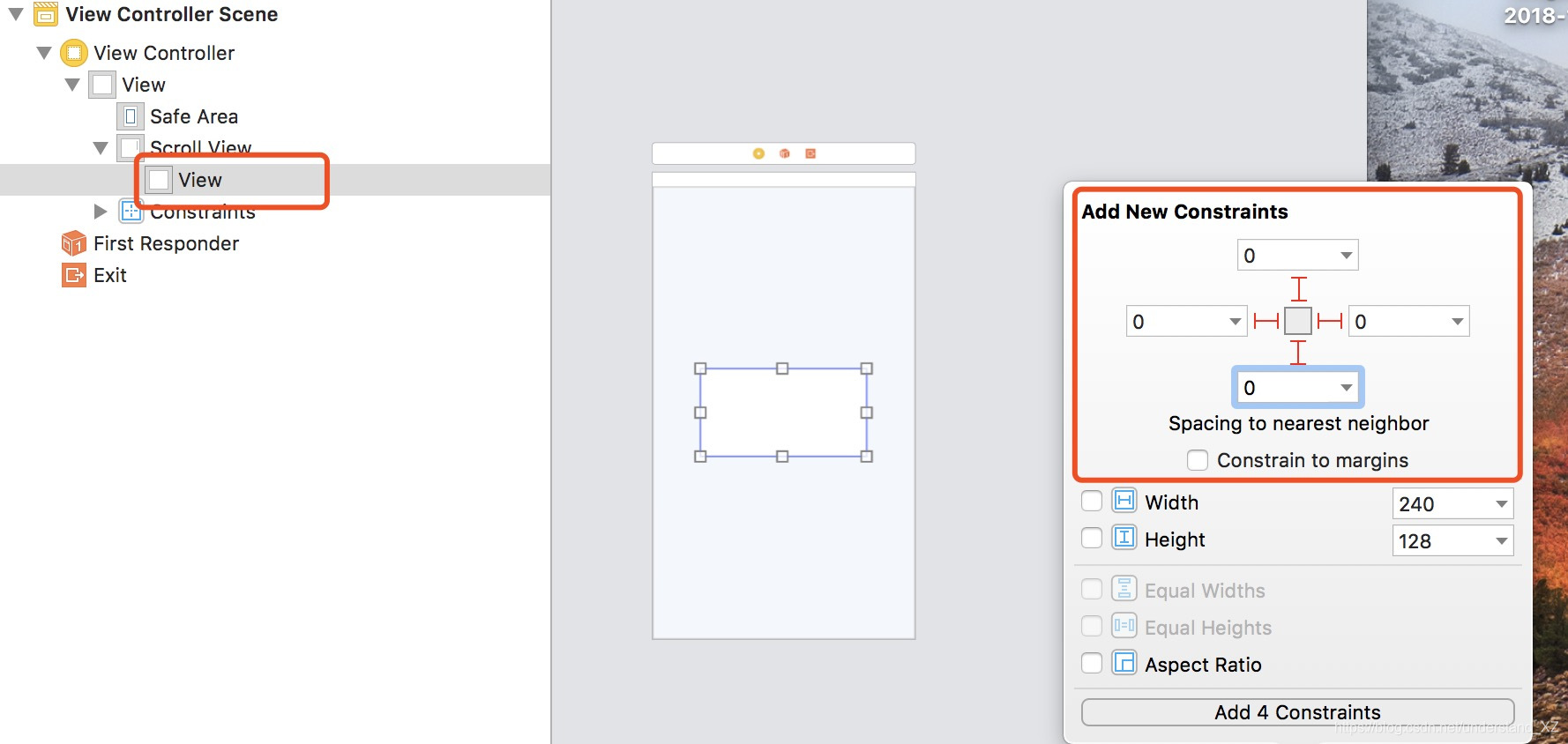 首先,在控制器中添加一个scrollView,设置它的上、下、左、右约束相对于safeArea为0,如下图: