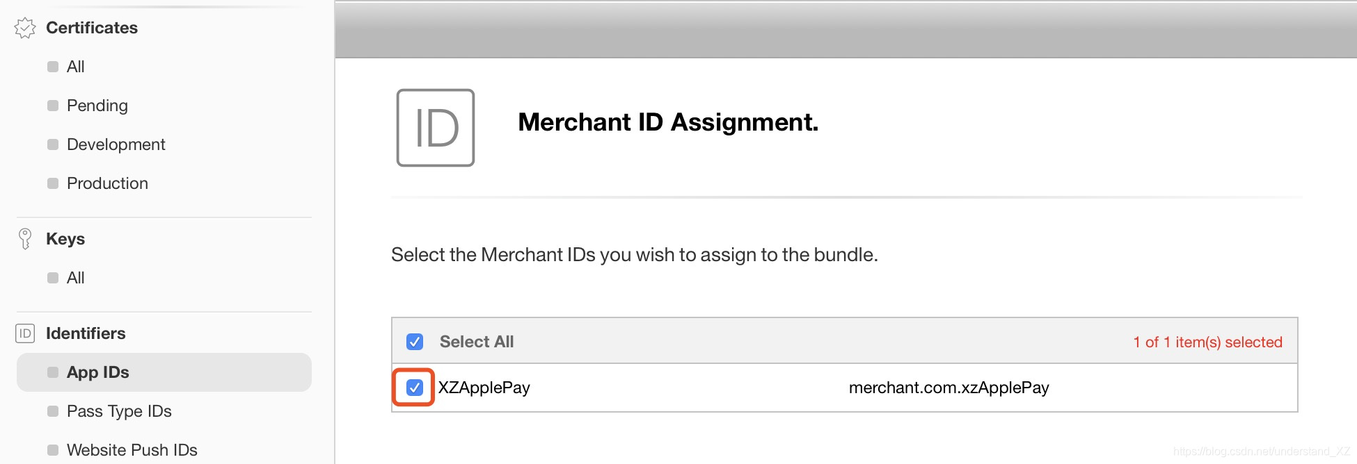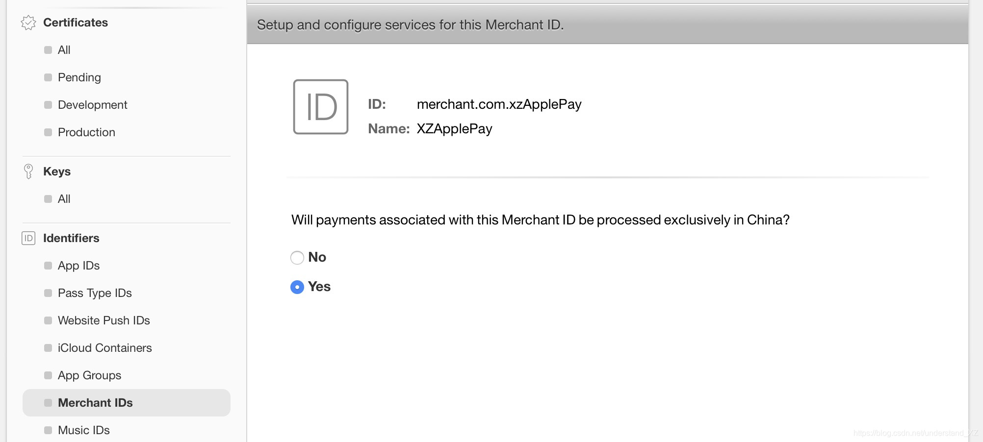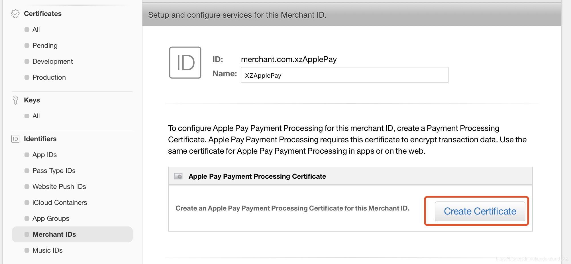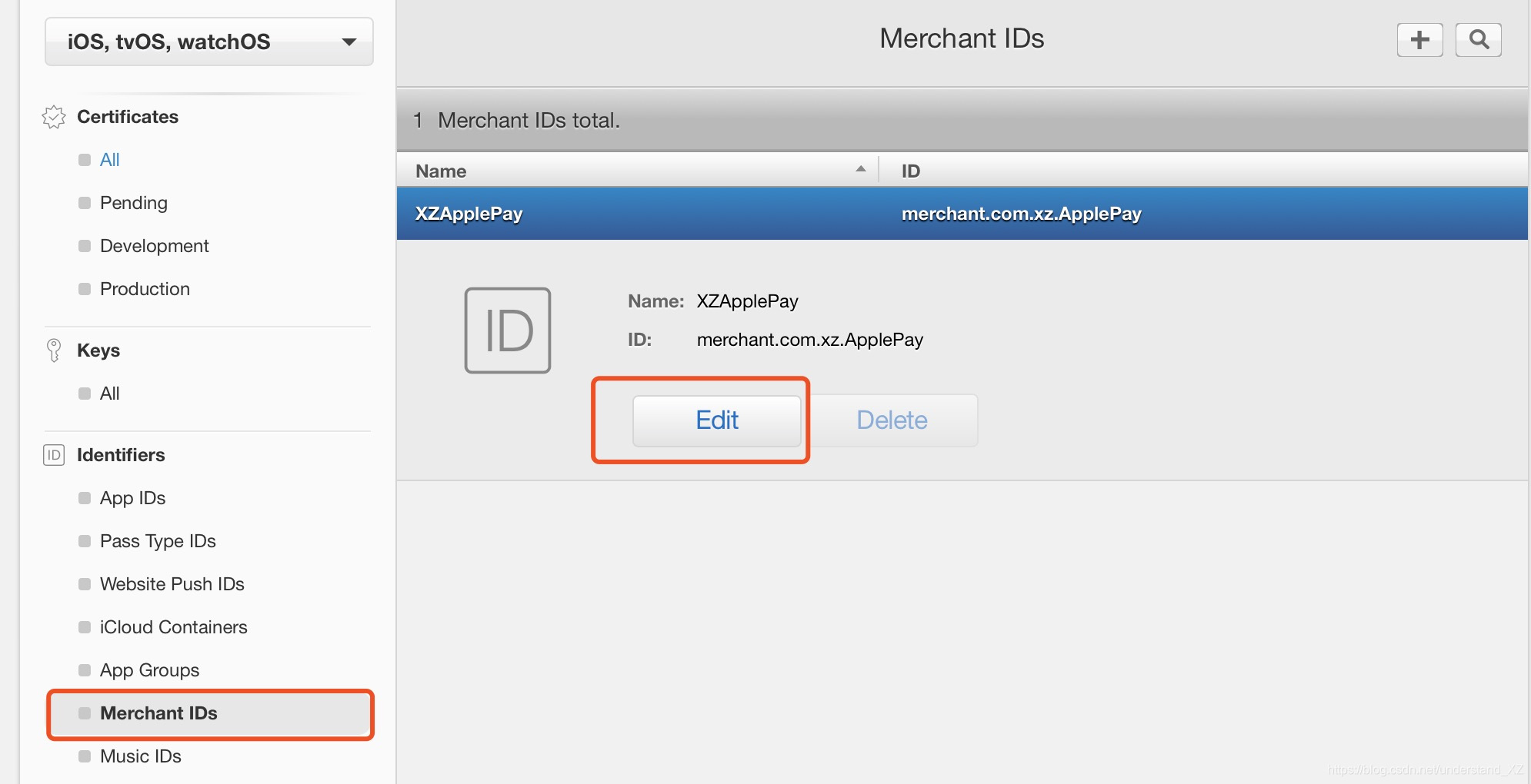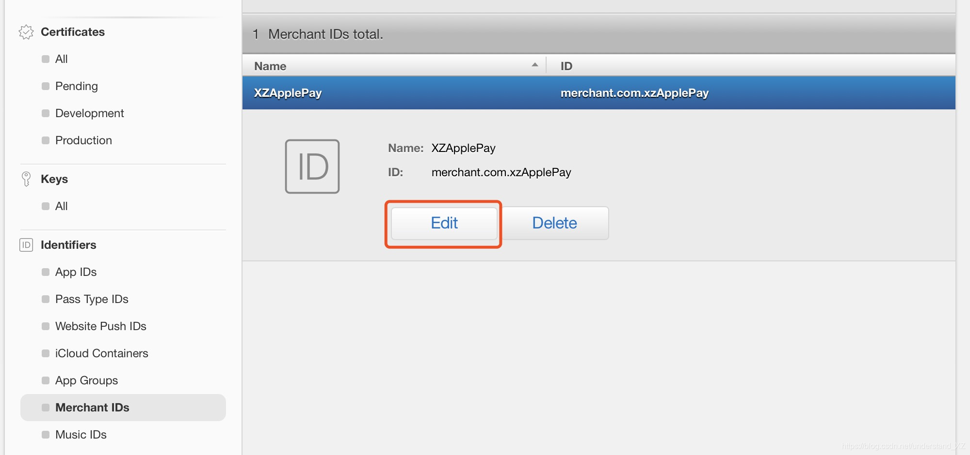 1>选中左侧的 Merchant IDs,选择刚创建的 Merchant ID,点击Edit,如下图: