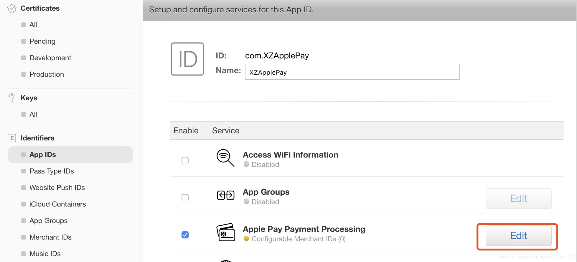 点击 App IDs,选择刚才创建的 App ID,点击 Edit。