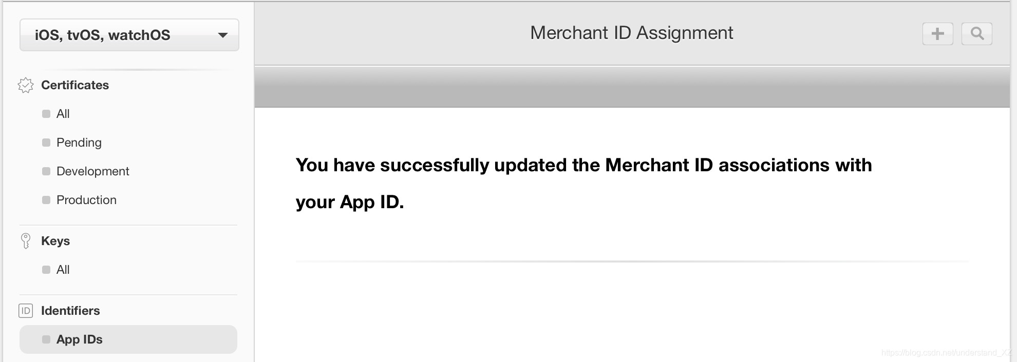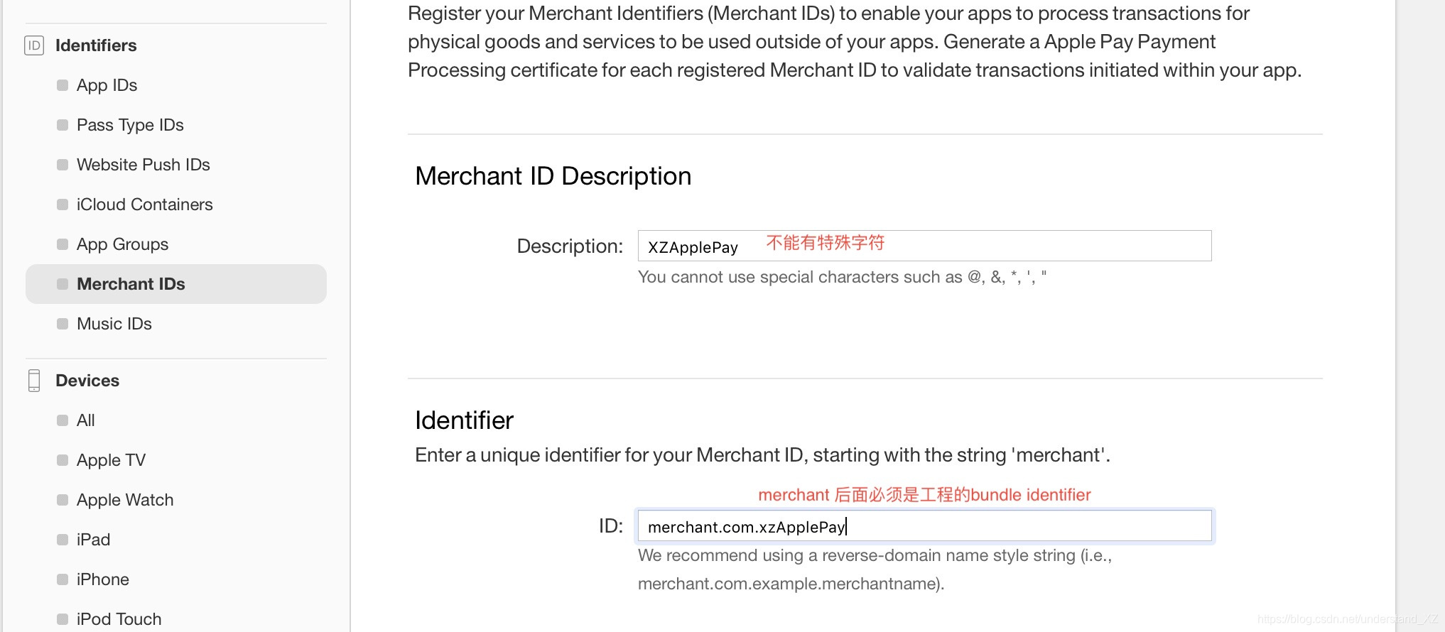 1>在 苹果开发者中心,Identifiers下找到 Merchant IDs,如下图: