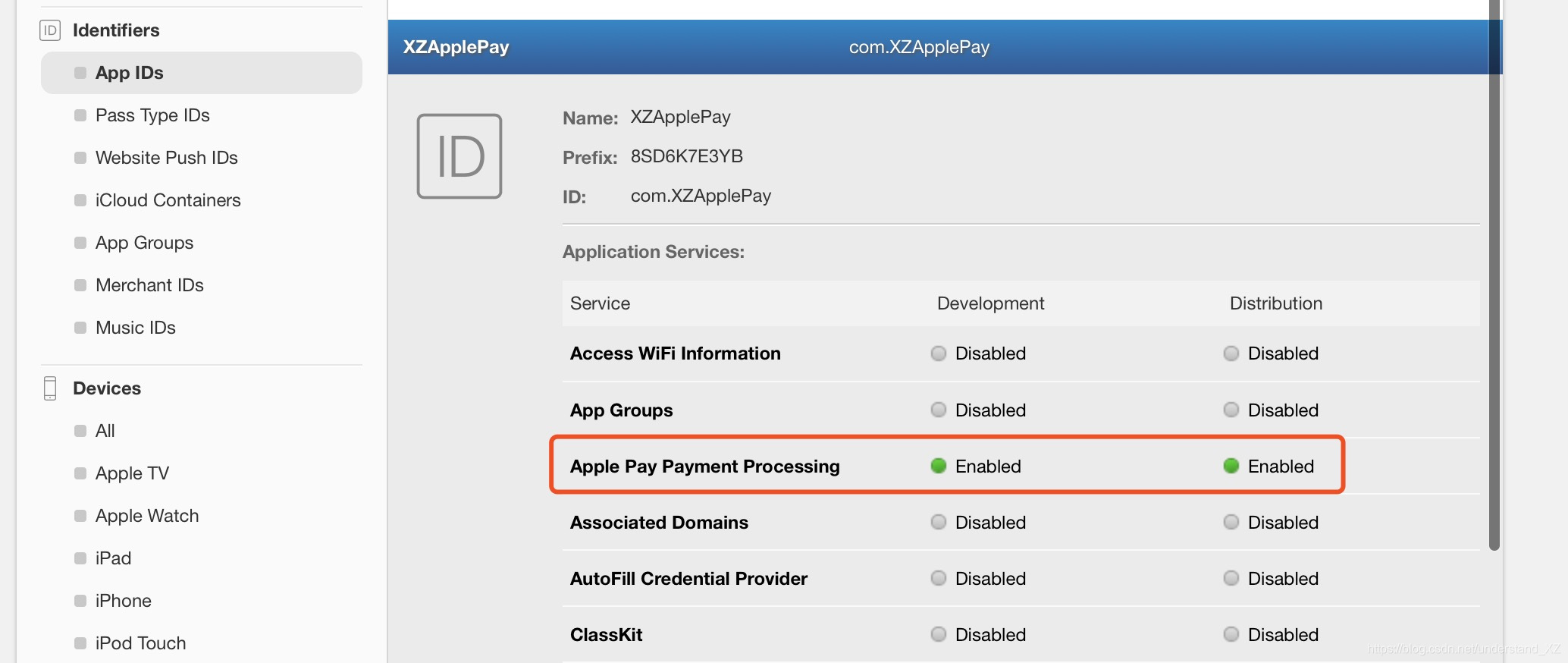 验证是否配置成功:App IDs - 选中当前 App ID,点击Edit,是下图说明配置成功。