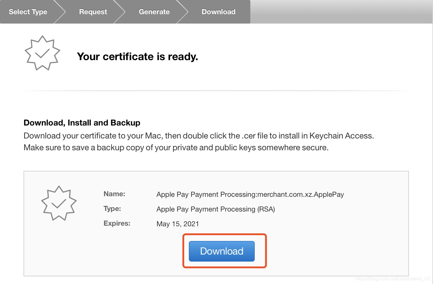 生成之后,点击 'Download' 下载证书到电脑,双击证书安装到钥匙串中。
