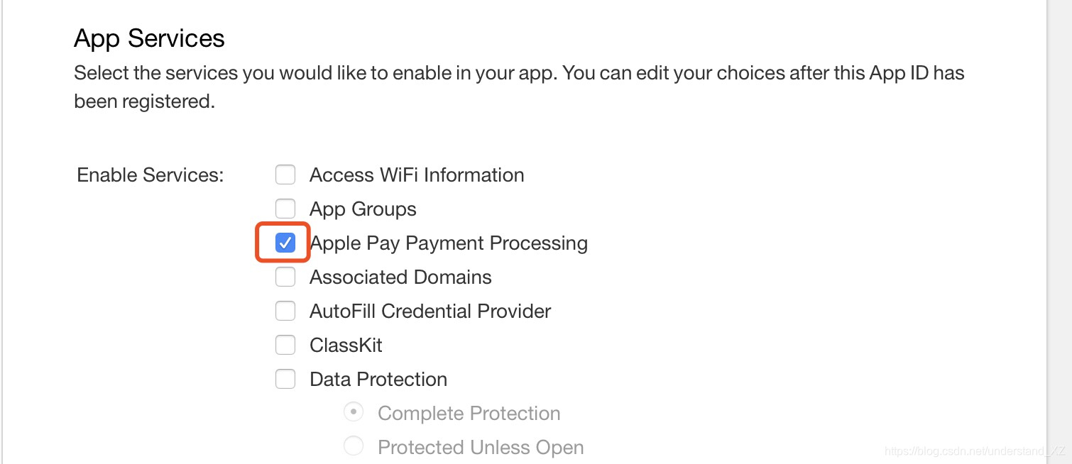 App Services 根据需要选择即可,选中Apple Pay Payment Processing