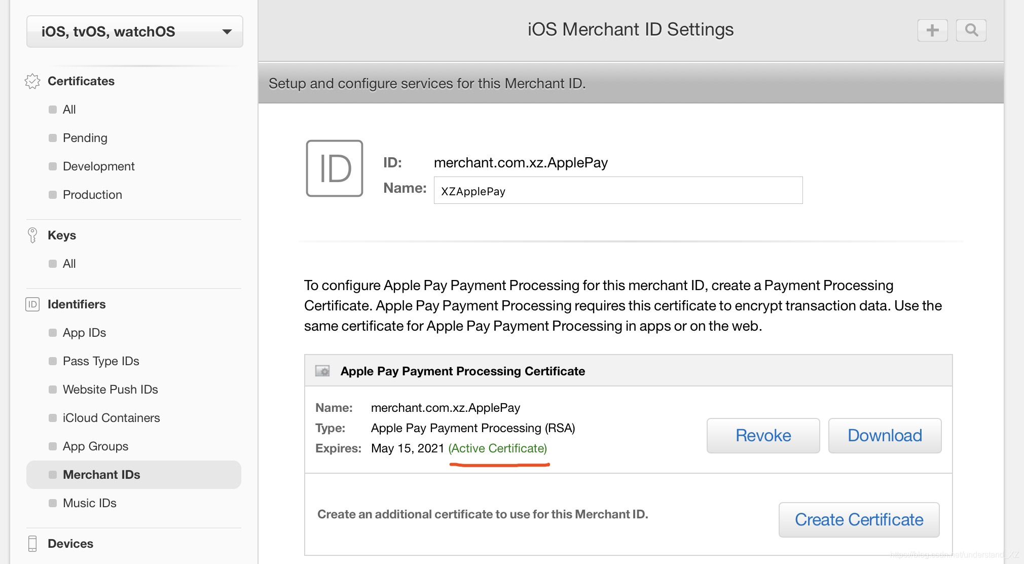 如何验证我们 Merchant ID 是否有效呢?点击Merchant IDs,选中创建的 Merchant ID,点击'Edit'