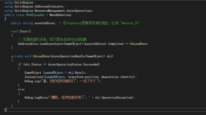 2.资源管理要精明:别把所有资源都塞在一个篮子里。使用 Addressables(可寻址资源系统)进行动态加载。