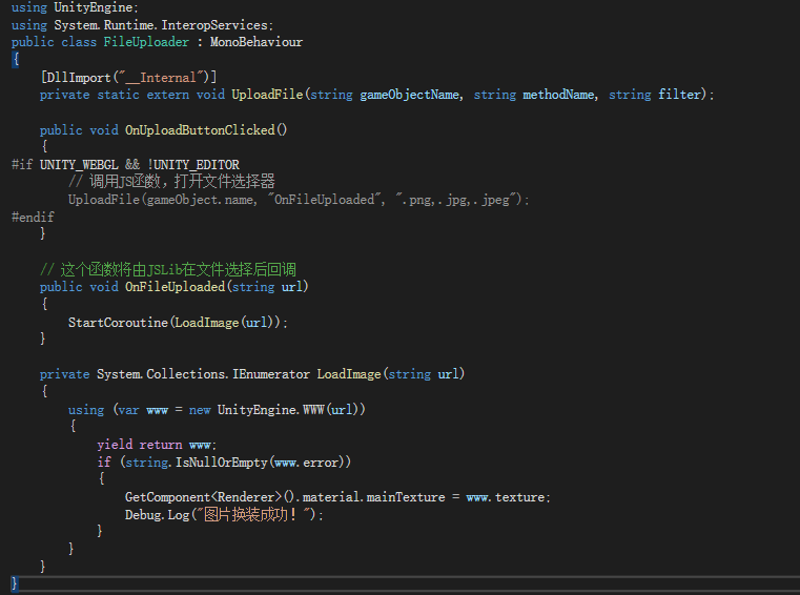 对应的 JSLib 部分(简化版)也需要实现 UploadFile 函数,这里篇幅所限不展开,但原理是创建一个隐藏的 <input type="file"> 元素。