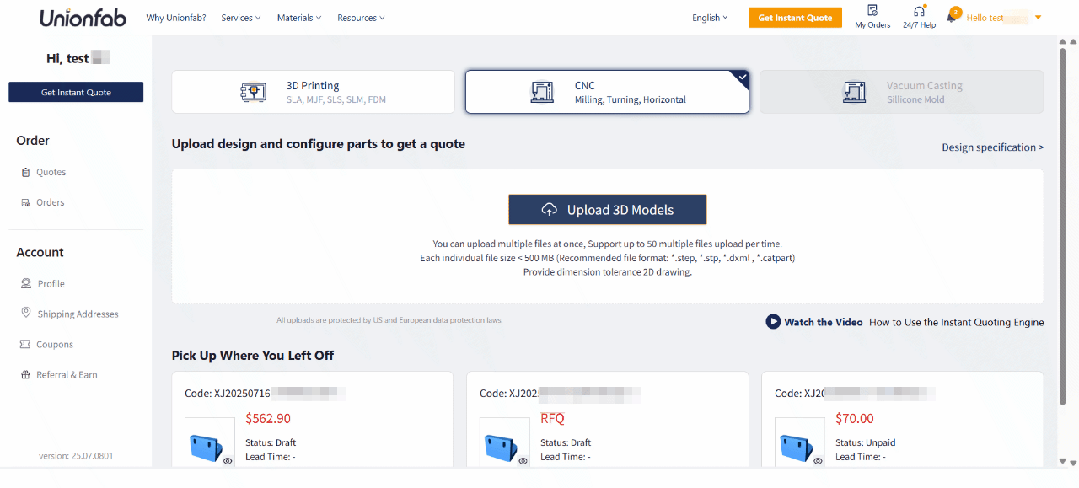 Unionfab ONE在线商城功能可整合分散加工资源,支持多种工艺,帮助用户便捷获取定制化零部件制造服务;自动报价功能则能通过 AI 算法快速解析模型文件,结合材料、工艺等因素生成报价及交货时间,提升零部件采购效率。