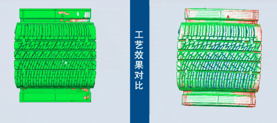 在轮胎模具领域,联泰科技选用两款由X-Tyre 009材料打印而成的轮胎模具,通过三维扫描测试来对比展示其效果图的差异,对于存在翘曲现象的模型,其扫描图显示出明显色差,而最新工艺下的效果图颜色更加均匀统一。