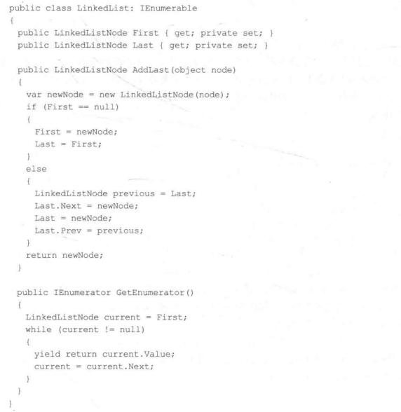 然后我们看到链表本体LinkedList,有一个指向开头的和指向结尾的,从代码中可以看出,这个指向开头的是指在第一个元素上(有些链表是在第一个元素前放一个元素,然后让头指针指在上面)。链表还实现了IEnumerable接口,在鸡合的那章我们提到过这个接口,实现这个接口可以让类可以被 foreach 语句遍历,从代码上看是从前往后遍历元素的值。