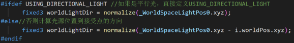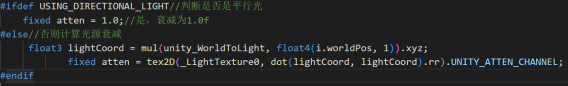 同样,在计算衰减的时候也要区分平行光和其他光源,还记得上面说的吗,平行光没有光源衰减,或者说平行光的光源衰减永远是1。因此使用的判断语句和上面的类似,也是