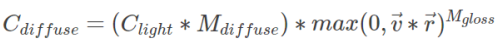 通过公式可以发现,与上边的漫反射公式很类似。不同的是,增加了一个Mgloss 高光反射系数,可以通过此系数调整高光区域大小。还有漫反射的法线和灯光方向点乘改成了视角方向和反射方向点乘。等式后面的第一个括号其实就是漫反射方程里的kd 这个概念。