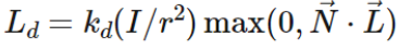 此公式中,kd是漫反射系数,对物体表面吸收率调节,可以用来模拟人眼看到的物体是什么颜色。通常人眼看到的颜色是物体不吸收,被反射出来的颜色。例如绿色的树叶,吸收了除绿色之外的颜色,那么人眼看树叶就是绿色的。I/r^2 是衰减公式。由于unity中的平行光没有光源衰减,所以暂时可以不用考虑。Max函数用来限定向量N和向量L点乘的数值,不低于0,低于零是黑色,反正都是黑色,数值多少就无所谓,还能避免出现奇怪的情况,使用max()函数可以直接舍弃负数。 向量N是法线向量,L是光源方向向量。