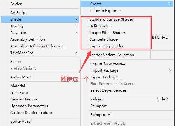 随便选一个就好,然后就创建好了一个Shader文件,然后命个名字。Shader文件的命名不像.cs(C#代码文件)要求文件名和类名一样,Shader文件名字不一样一样用,但还是建议和内部命名一致。