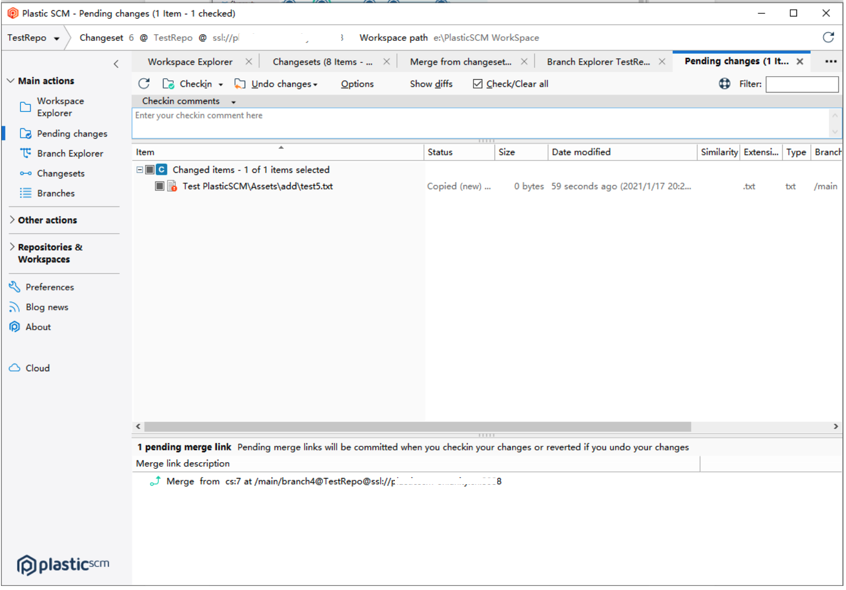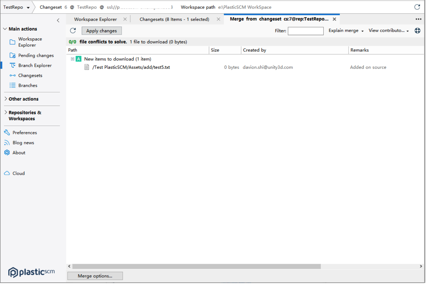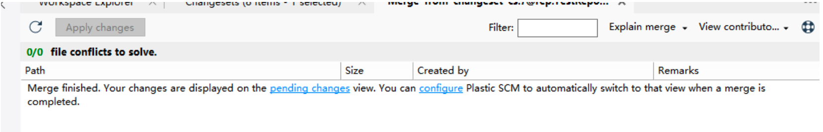 Plastic会跳转到Merge from changeset面板,选择Apply changes