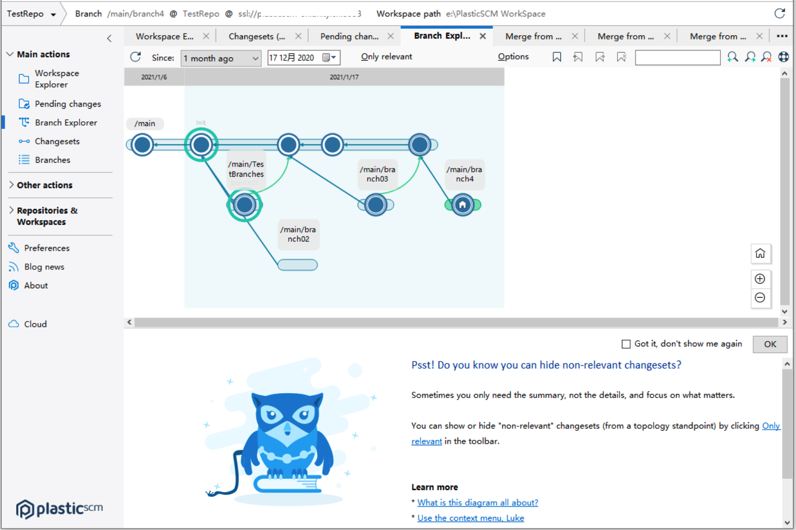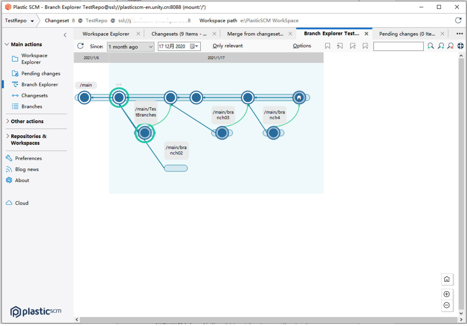 上面的操作对于单线管理已经足够了,但是如果有需求需要开分支进行多线管理时,就需要创建分 支。 在Branch Explorer中,可以看到当前的版本树,然后选择某个你想要的版本,在创建分支前,建 议先通过右击选择Label this changeset,给这个版本添加一个label,用于记录这个版本的一些特性,然 后右击选择Create branch from this changeset,来创建一个分支。在新的分支中,你的这些改动不会影响主分支,可以自由的提交改动进行测试。