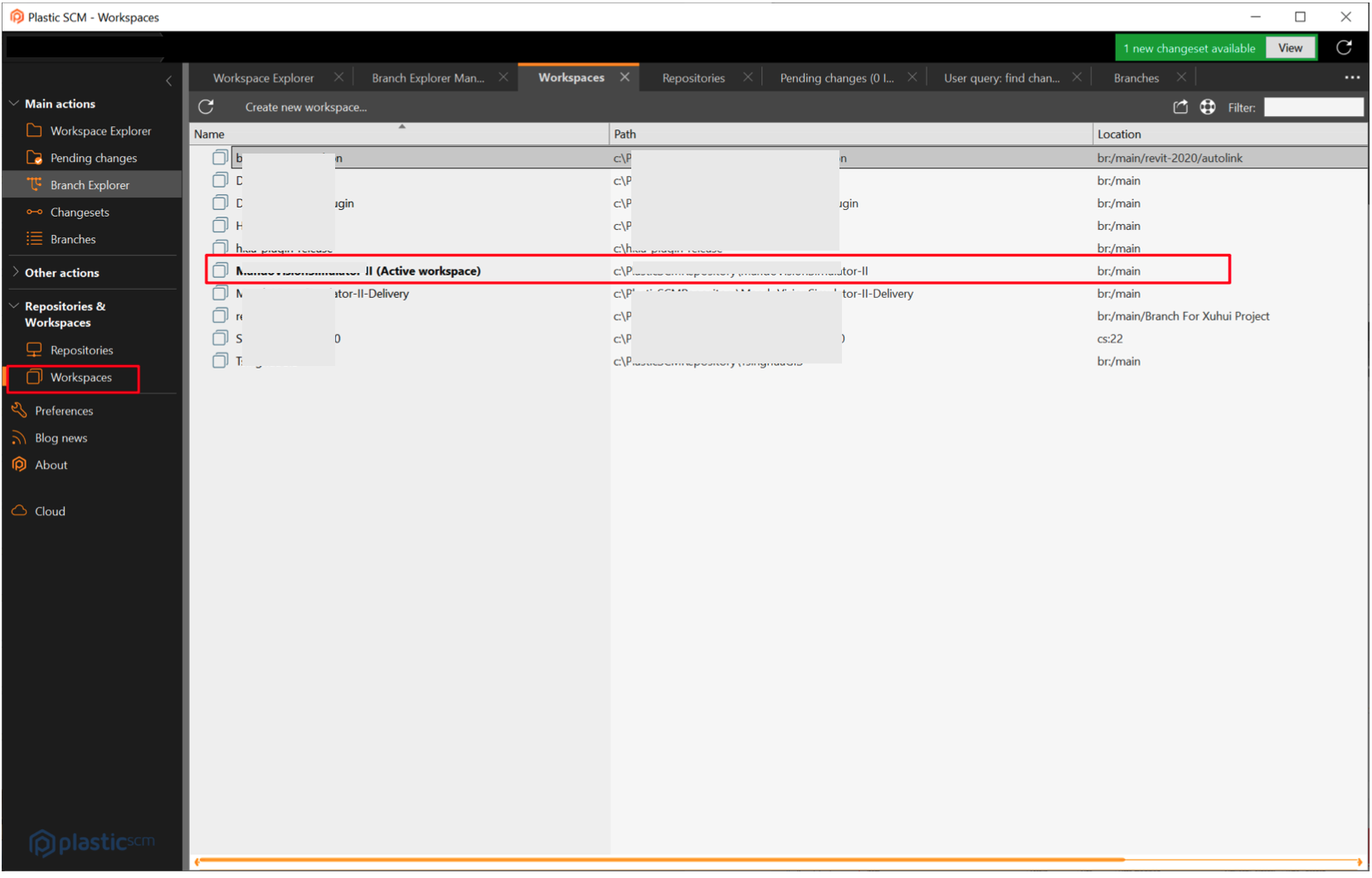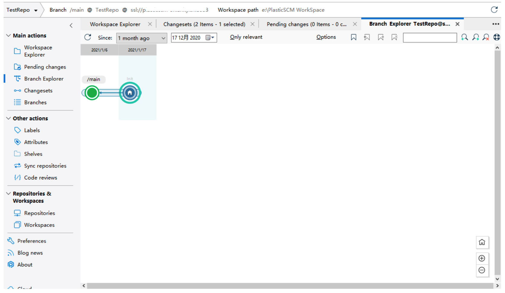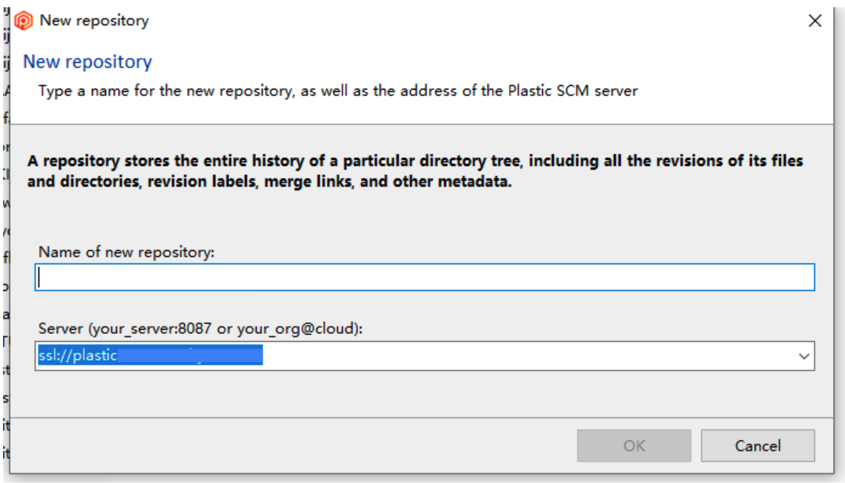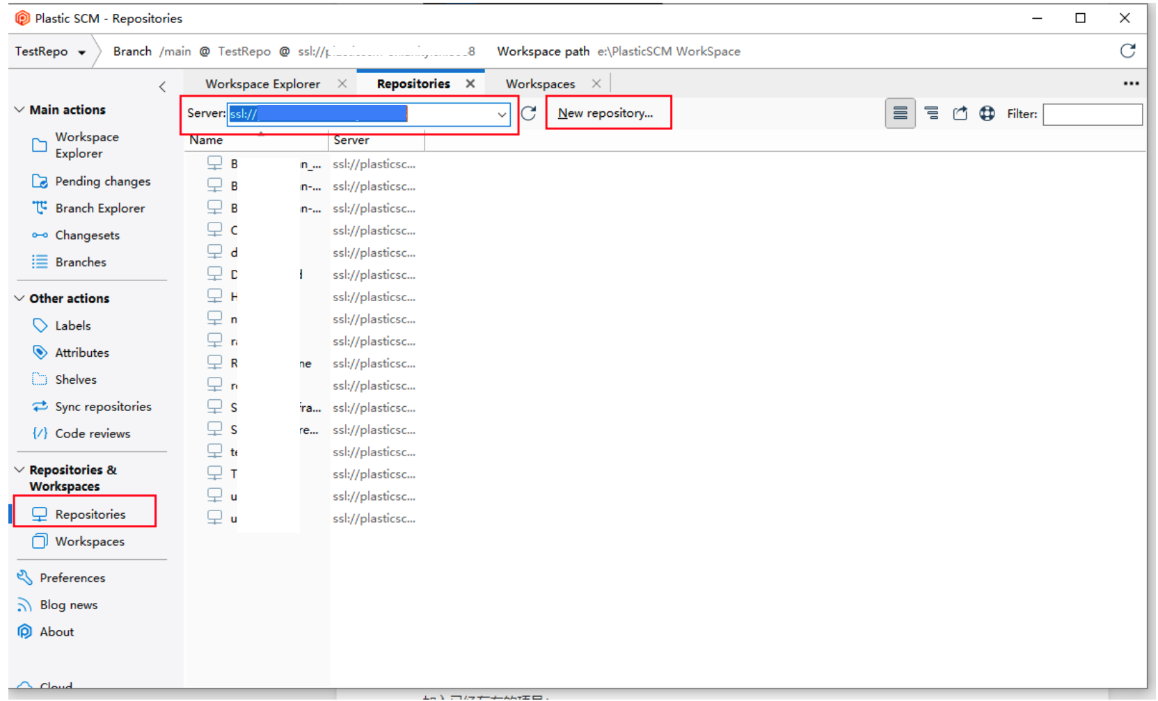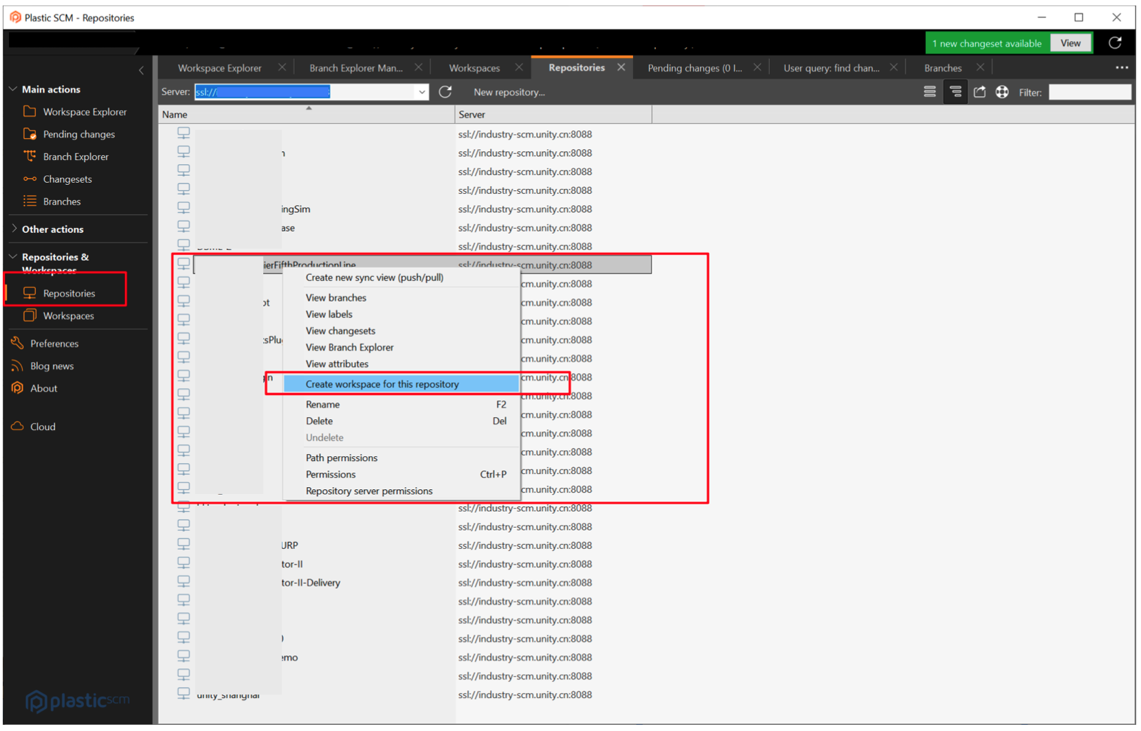 在左侧面板打开repositories面板,在新出现的repo面板中点击New repositories,注意server的url是否正确(目前中国更新版PlasticSCM允许cloud.cn简明服务器地址后缀)