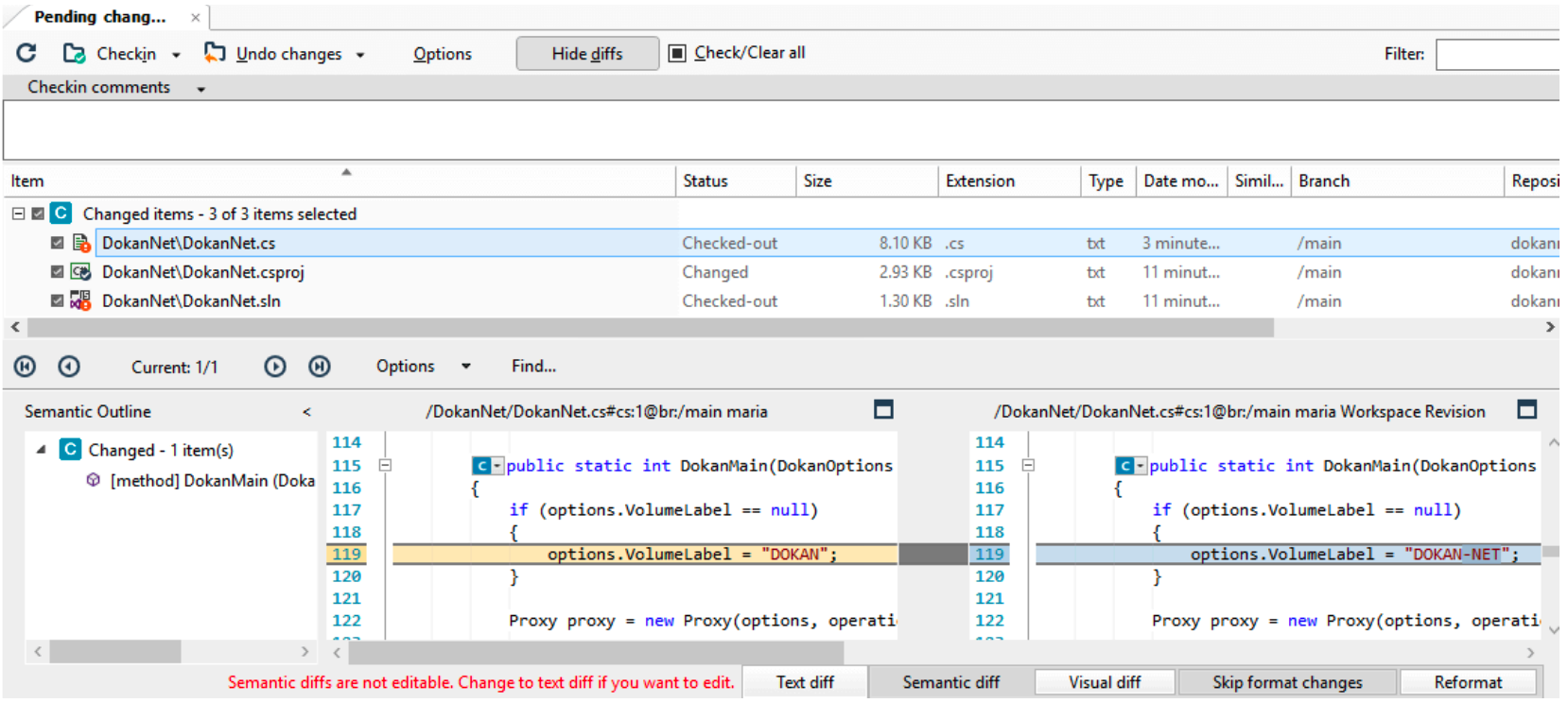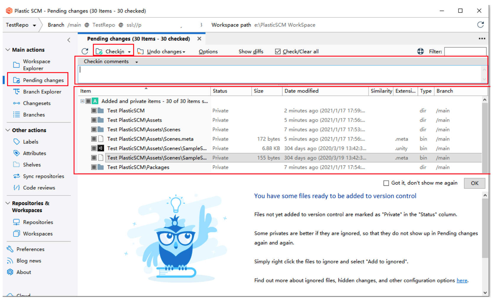 在对项目中的文件进行修改后,可以在Pending changes中查看这些改动,在Checkin comments中 对本次修改的内容进行说明后,点击checkin按钮对本次修改进行提交。 当然,如果其中存在暂时不想上传的文件,可以在下面的详细内容中取消勾选这个文件。 如果存在永远不想上传的文件,可以右击这个文件,将其添加到ignore list中。
