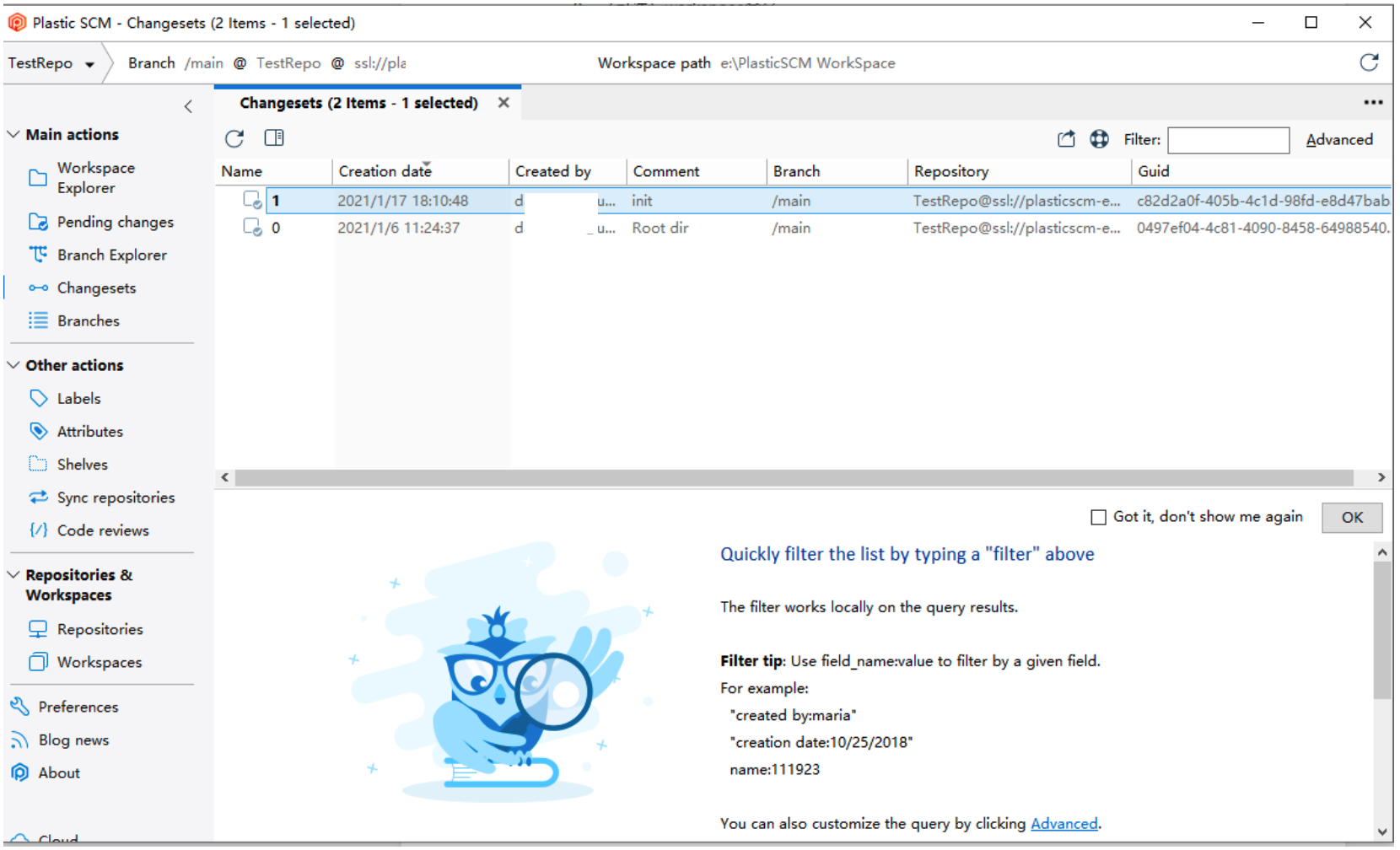 plasticSCM与svn的架构相似,workspace为本地存放项目文件的空间,本地不对仓库进行维护,所有的提交操作都提交到云端服务器的repo。