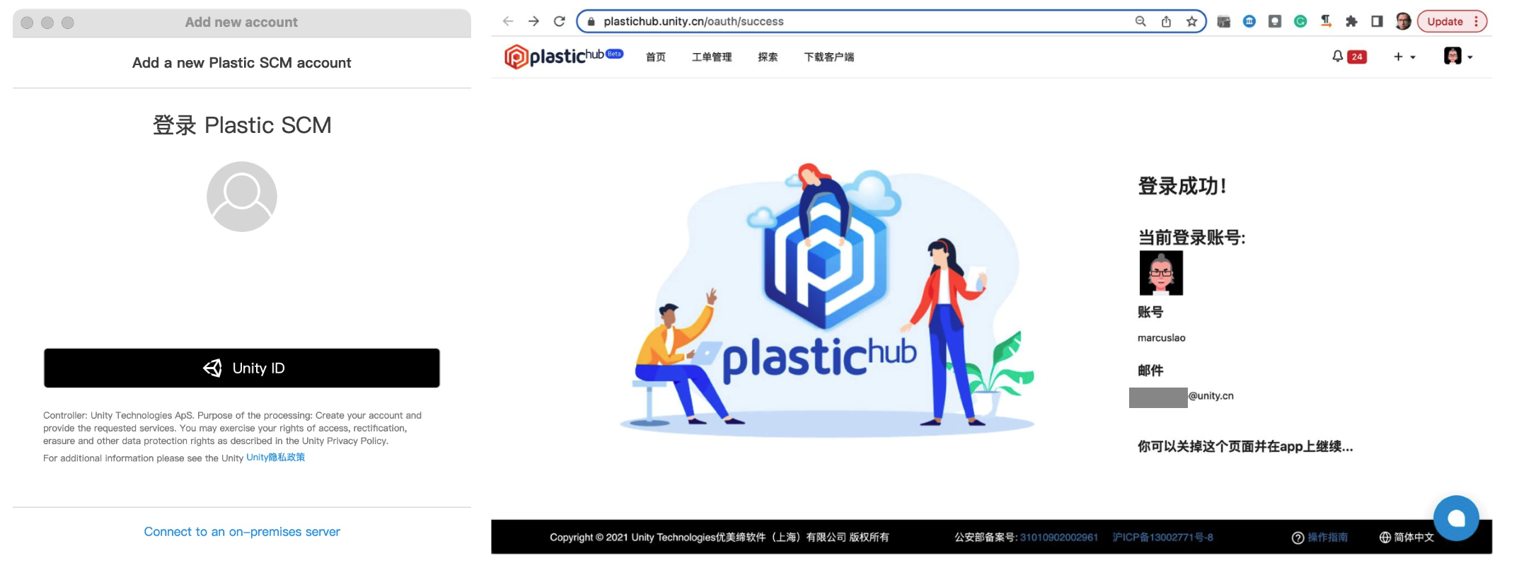 Unity ID 一键登录,Plastic客户端会直接拉起 plastichub网页端进行账号登录状态认证