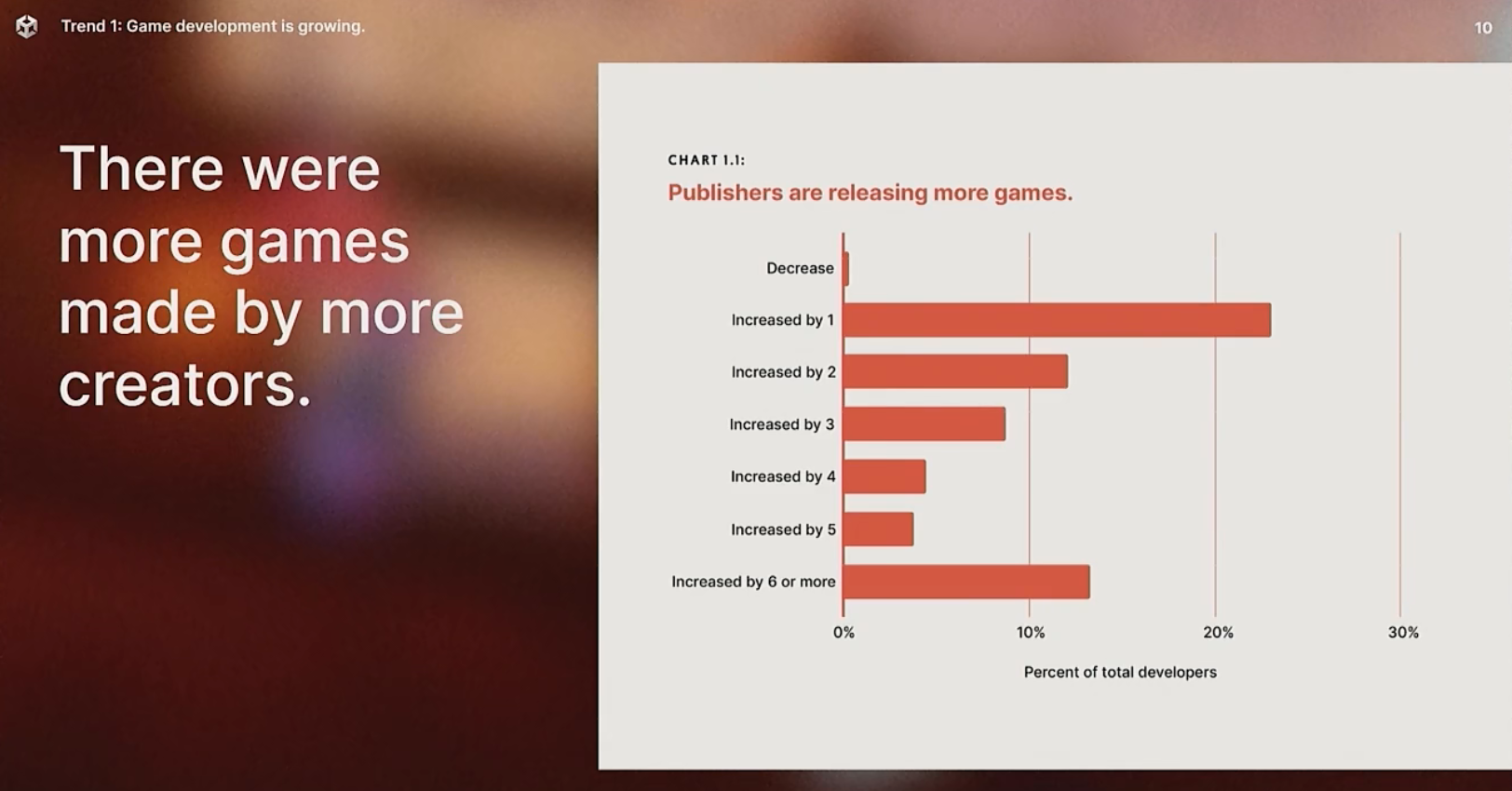 - 大多数游戏开发团队都在今年或多或少的增加的发布的游戏数量