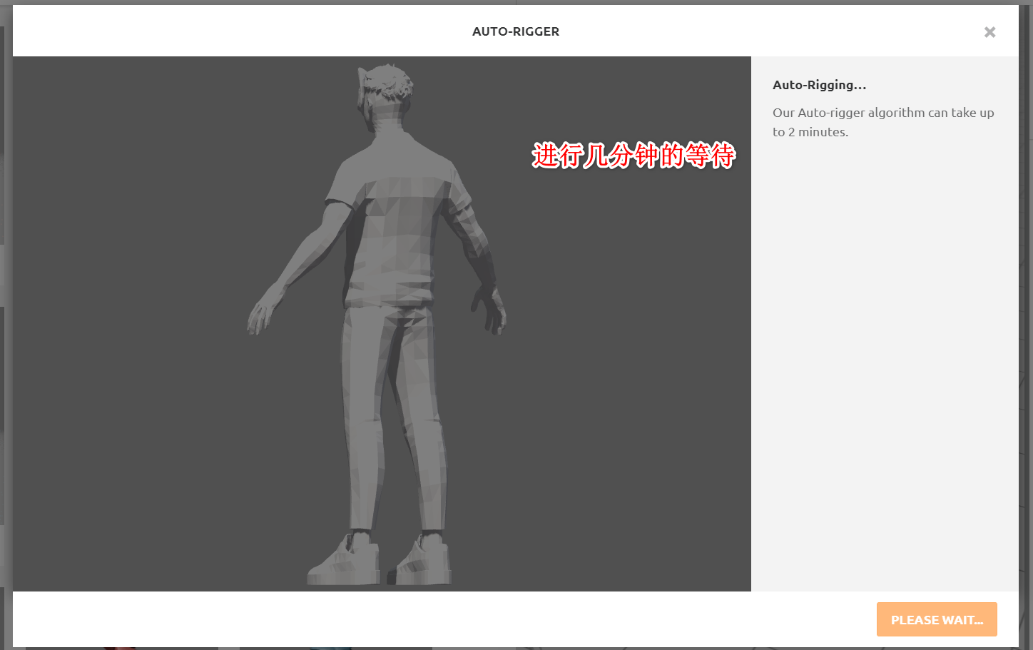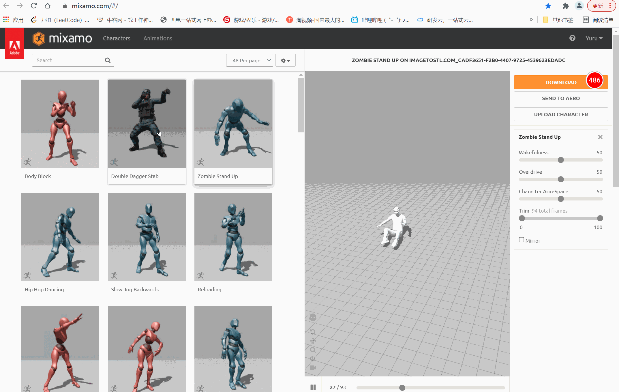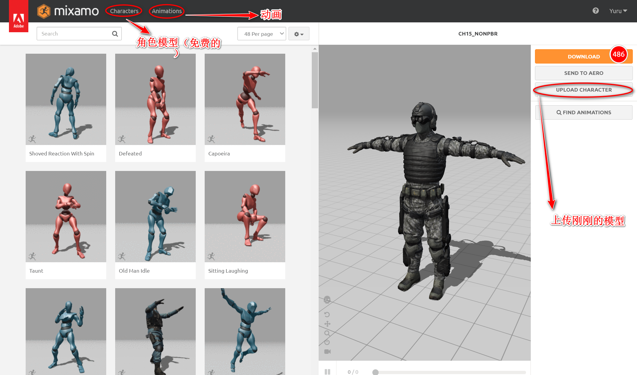 ④转化好后,就可以Upload到mixamo了,这里转化好后模型可能会倒在地上,没关系,mixamo可以处理