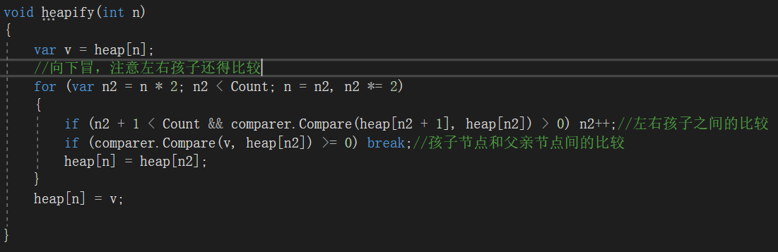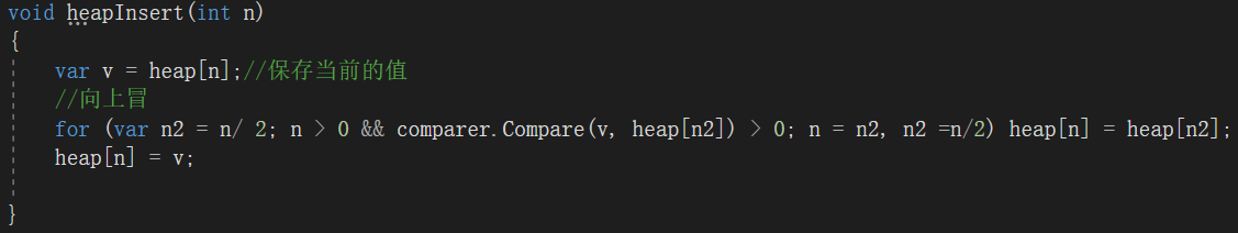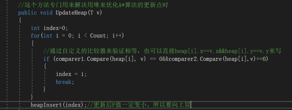 时间复杂度为O(n),我们只需要找出最小F的点,正好使用优先队列(小根堆)来实现,但由于C#没有自带的模板(注意C++和Java虽然自带了优先队列,但自带的那个没有自调整功能不能用),我们就自己来实现一个。优先队列主要操作就两种heapInsert和heapify,对应节点向上冒和向下冒。然后最主要的就是要能在更新F值后仍然维持小根堆(见下图UpdateHeap方法),然后在添加和删除(Push和Pop)。
