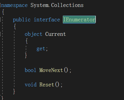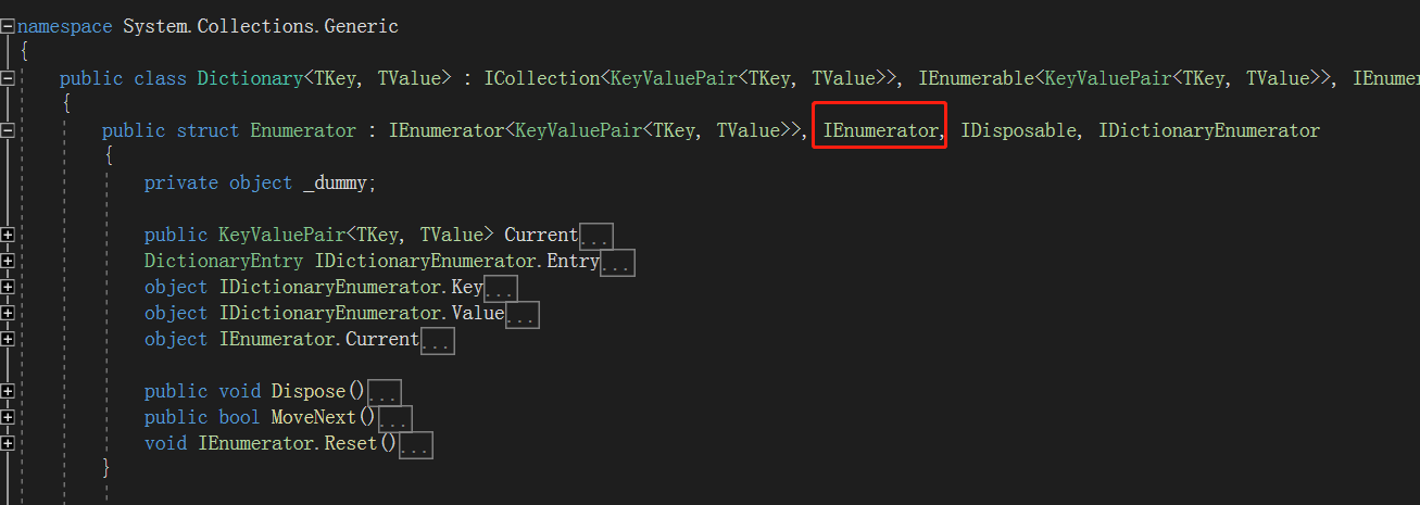 很明显这是个接口,并且字面意思枚举器或迭代器的意思,看下图可以看出这个接口的的目的是一个一个枚举出来,这应该会让你想到Dictionary的foreach