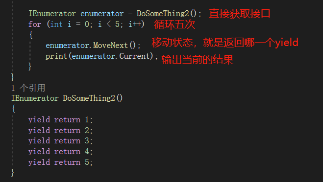 yield实际上就是返回一次结果,因为我们要一次一次枚举一个值出来,所以多个yield其实是个状态模式,第一个yield是状态1,第二个yield是状态2,每次访问时会基于状态知道当前应该执行哪一个yield,取得哪一个值。