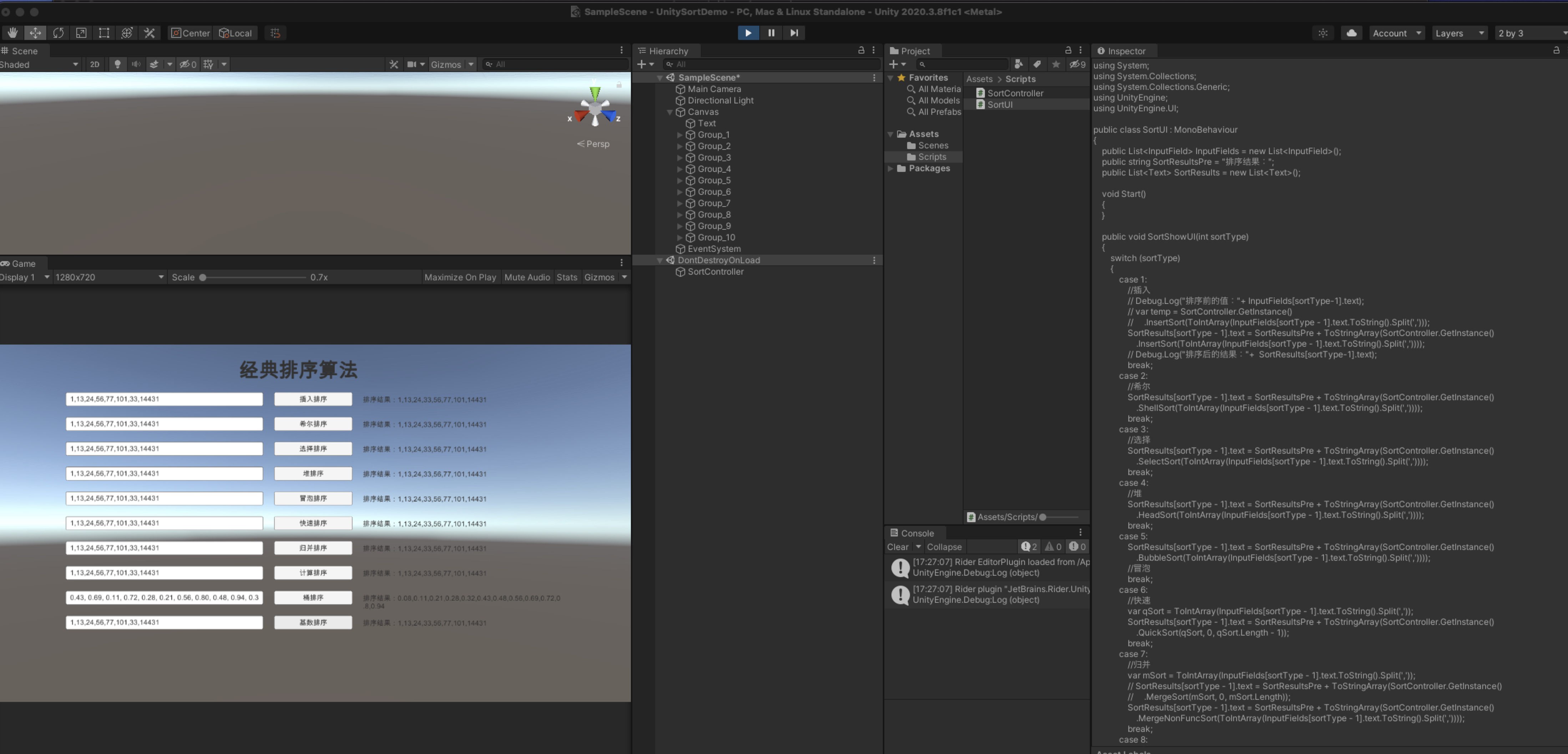 2、 排序算法可视化,使用Unity实现的排序算法演示系统: