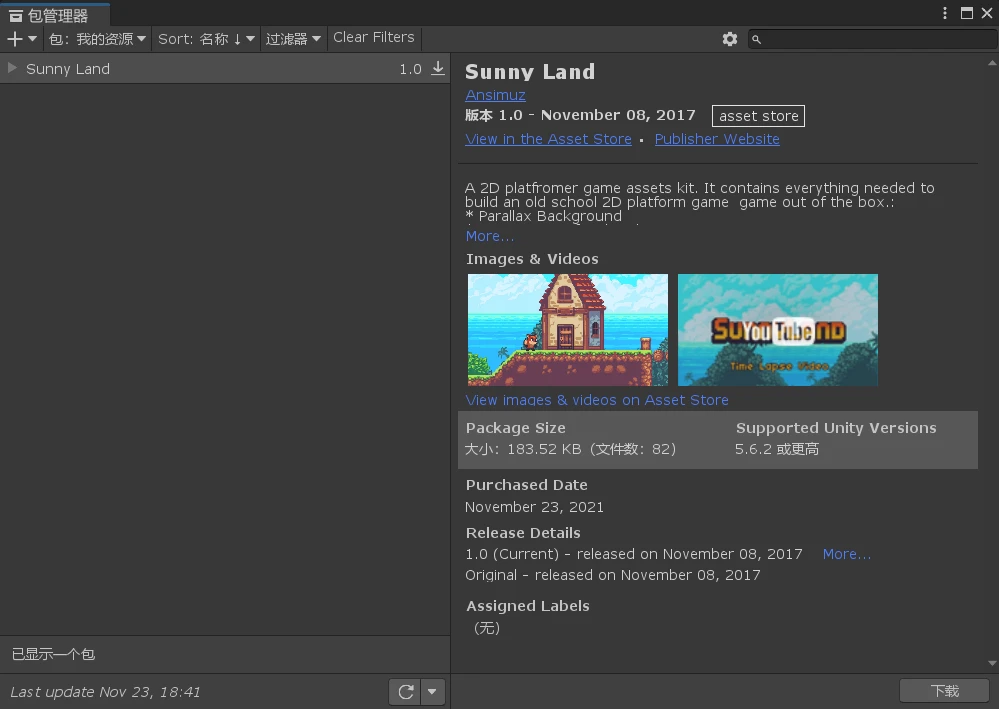 素材可以在资源商店中找到(免费资源),加入Unity账号后,可以点击页面上的“在Unity中打开”,即可在本机的包管理器中找到这个资源(可能需要加载一段时间,加载完毕后如下图所示)。