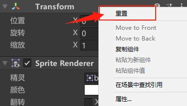 经过这七个按钮的操作后,如果希望将图片恢复为默认状态,通过在检查器窗口中右击Transform这一行字(如下图,也可以点击最右边的小齿轮),选中重置。
