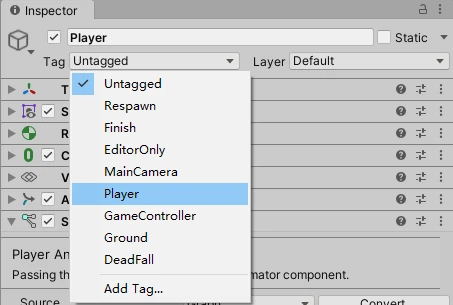 注意需要将玩家对象的Tag设置为Player才能使上面的脚本发挥作用。