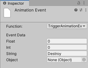 然后在Inspector窗口中选择触发的函数为TriggerAnimationEvent(AnimationEvent),并将String参数设置为Destroy。不需要设置这里的Object的选项,因为此项为空时默认为该对象本身。不设置具体的对象可以帮助我们方便地将这个逻辑移植到所有敌人对象中。